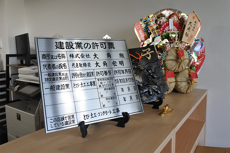 | 許認可・加盟 | 建設業 愛知県知事許可 般-30 第61039号 - とび・土工工事業 鋼構造物工事業 - |